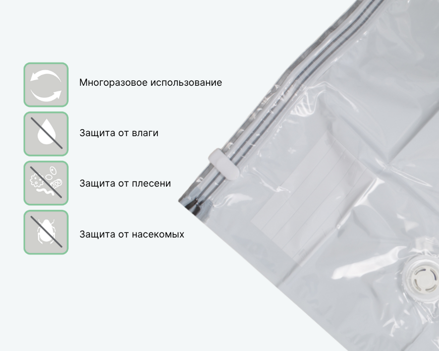 Пакет вакуумный SWED плоский 60х80 см предназначен для хранения больших объемов одежды, постельных принадлежностей и других предметов. Вакуумное хранение позволяет сэкономить до 80% пространства, защищая вещи от влаги, пыли и насекомых. Благодаря запатентованной застежке-молнии и надежному клапану, вакуум сохраняется долгое время, а вещи остаются в идеальном состоянии. Пакет имеет специальное поле для записи, что позволяет удобно пометить содержимое пакета, облегчая организацию хранения и обеспечивая быстрое нахождение нужных вещей. Пакет можно использовать многократно, что делает его удобным и экономичным вариантом для хранения.