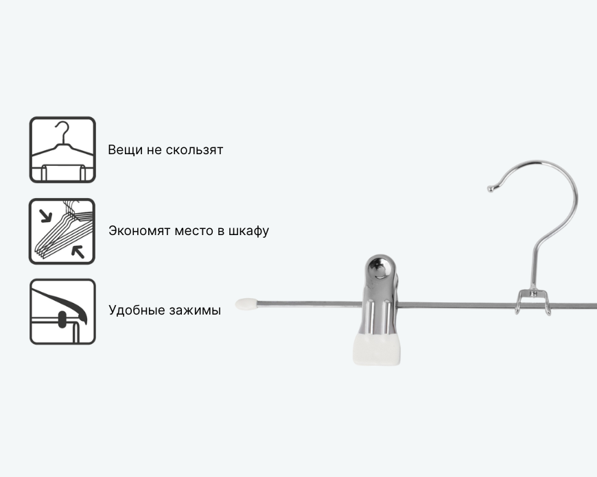 - — Вешалки для брюк и юбок оснащены зажимами, которые надежно удерживают одежду, не повреждая ткань.