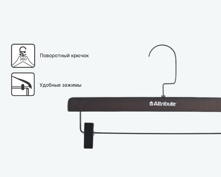 Вешалка для брюк и юбок GEOMETRY с удобными зажимами — это практичное решение для хранения нижней части гардероба. Поворотный крючок на 360° делает вешалку удобной для использования, а зажимы надежно удерживают брюки или юбки, не повреждая ткань. Вешалка выполнена из темного дерева, а металлический крючок с необычным дизайном придает ей стильный и элегантный вид.