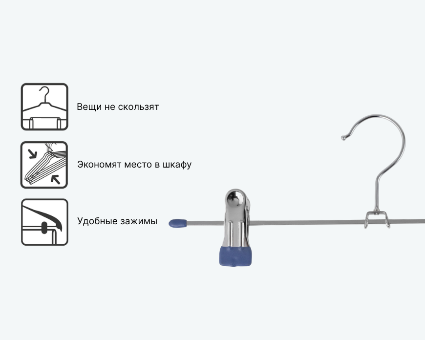 - — Вешалки для брюк и юбок оснащены зажимами, которые надежно удерживают одежду, не повреждая ткань.