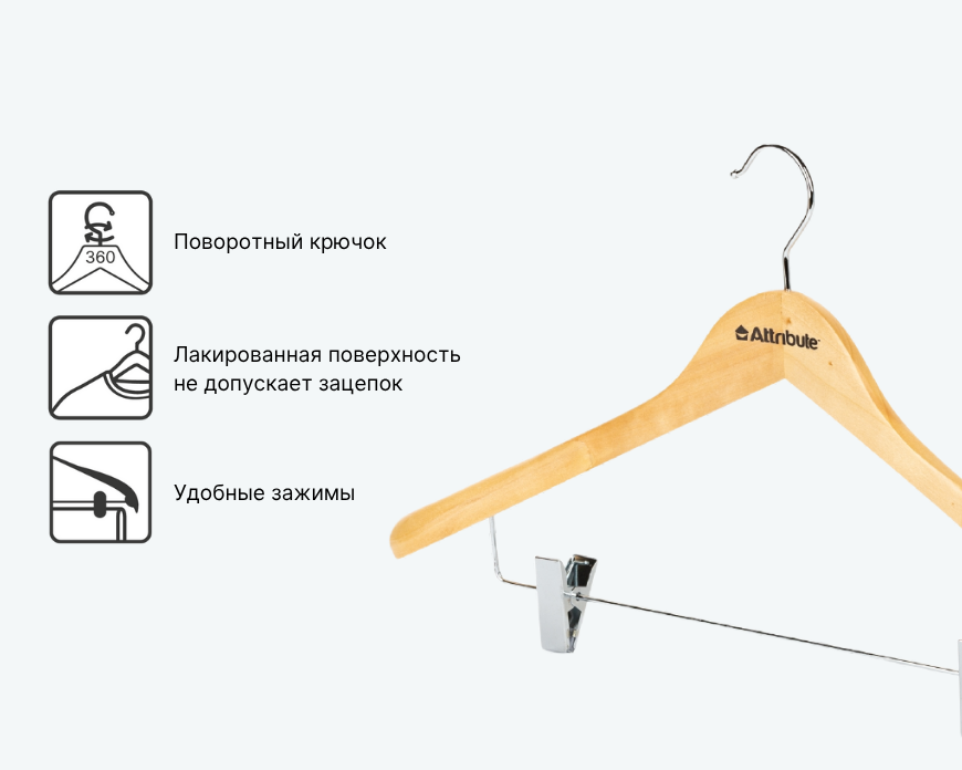 Вешалка для костюма CLASSIC 44 см идеально подходит для хранения деловых костюмов. Поворотный крючок на 360° позволяет легко разместить вешалку в любом положении, а удобные зажимы надежно удерживают брюки или юбки, не повреждая ткань. Лакированная поверхность вешалки предотвращает зацепки, а светлое дерево придает ей классический, элегантный вид.