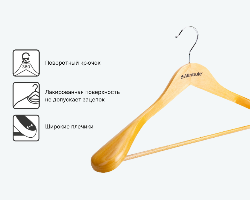 - Широкие плечики поддерживают форму верхней одежды, предотвращая её деформацию.