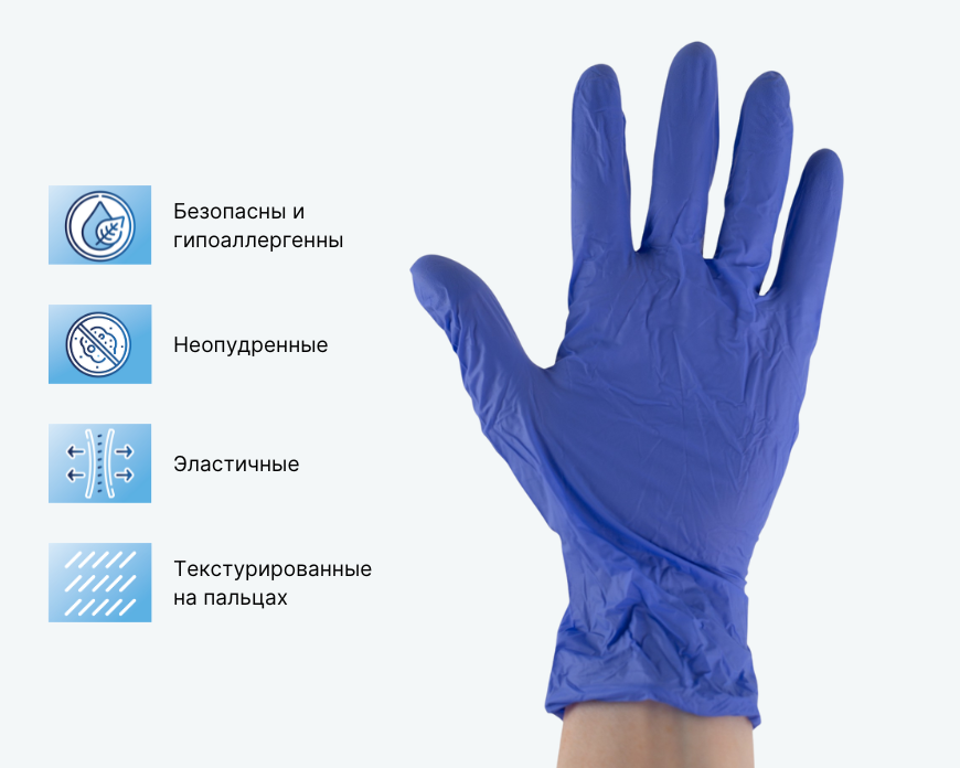- Гипоаллергенные и безопасные нитриловые перчатки без опудривания обеспечивают комфорт при использовании.