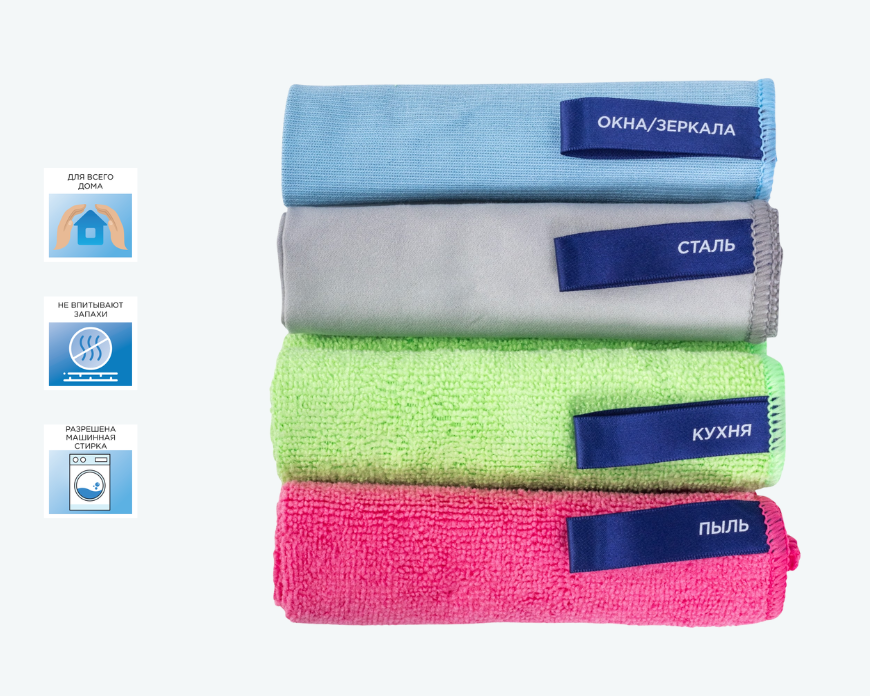 - Подходят для уборки по всему дому — от кухни до стеклянных и хромированных поверхностей.