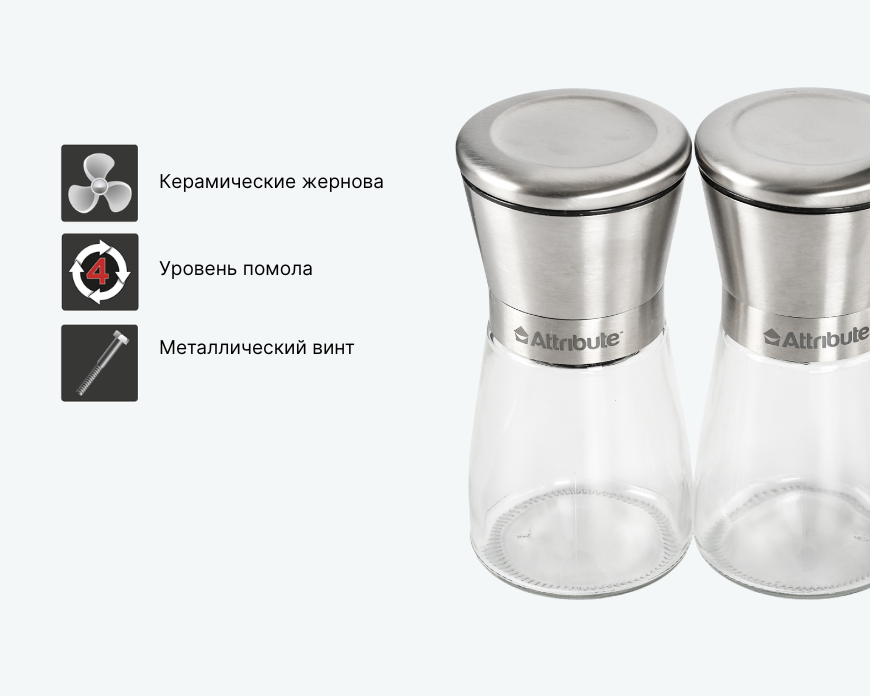 Дуэт стильных мельниц с крышками из нержавеющей стали подойдёт для соли и перца. Прочные керамические жернова, регулировка степени помола и стеклянный корпус делают использование удобным и функциональным. Отличный выбор для повседневного и праздничного стола.