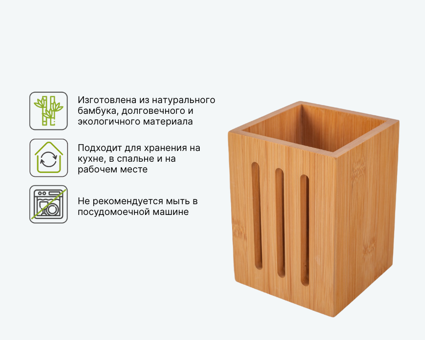 Подставка изготовлена из натурального бамбука — прочного, долговечного и экологичного материала. Компактная и функциональная, подходит для хранения ложек, лопаток и других кухонных принадлежностей. Может использоваться не только на кухне, но и в рабочем кабинете или ванной комнате. Органично впишется в интерьер и поможет поддерживать порядок.