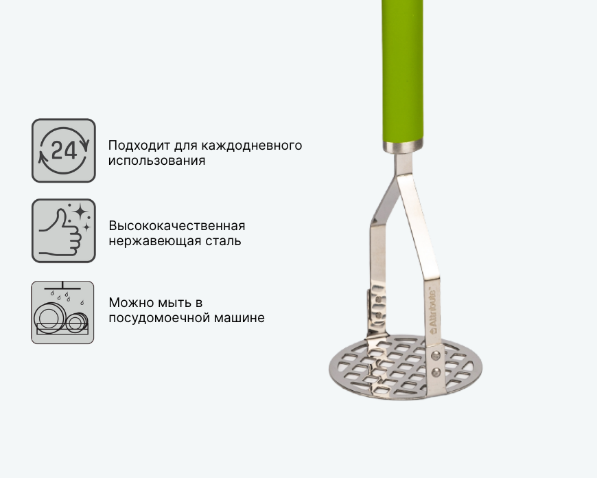 Картофелемялка LIME делает процесс приготовления картофельного пюре легким и эффективным. Рабочая часть из нержавеющей стали гарантирует долговечность и простоту в уходе. Эргономичная ручка с кольцом для хранения обеспечивает удобство в обращении и поддерживает порядок на кухне. С этим инструментом вы быстро создадите гладкое и воздушное пюре.