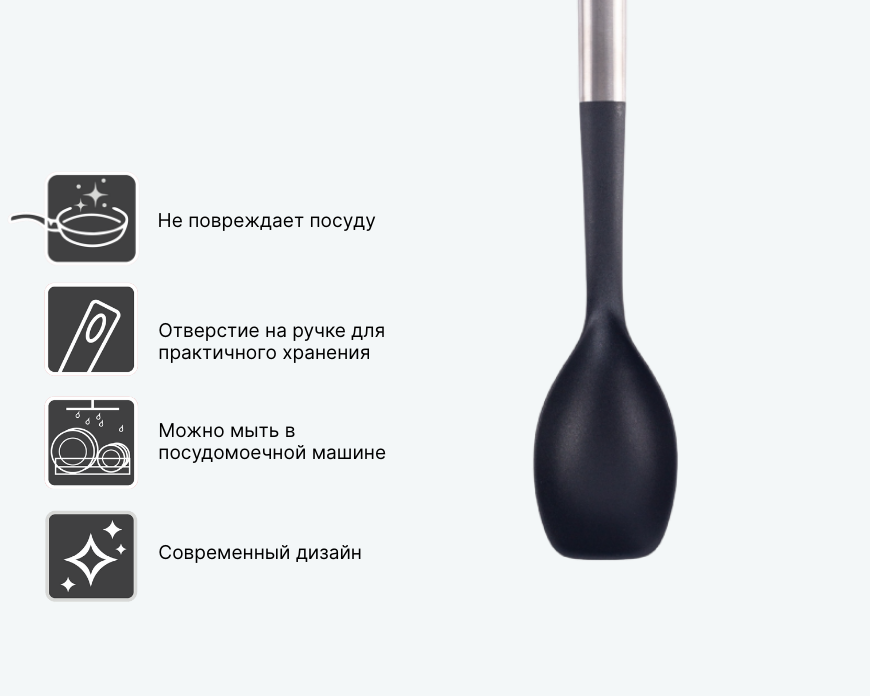 Ложка LEROY станет универсальным инструментом для приготовления и подачи блюд. Изготовленная из безопасного пищевого нейлона, она не повреждает посуду и надолго сохраняет свои свойства, не впитывая запахи. Современный дизайн ложки гармонично вписывается в любое кухонное пространство. Удобное отверстие на ручке позволяет легко хранить изделие, поддерживая порядок на кухне.