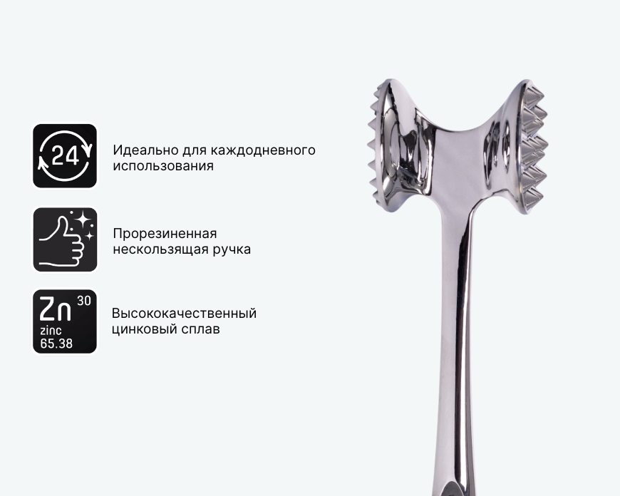 Молоток для мяса QUANTUM станет удобным помощником в приготовлении различных мясных блюд. Он изготовлен из высококачественного цинкового сплава, что обеспечивает прочность и долговечность при ежедневном использовании. Прорезиненные нескользящие ручки гарантируют надёжный и комфортный захват, позволяя легко и эффективно отбивать мясо. Инструмент сочетает практичность и удобство, делая процесс готовки более простым.