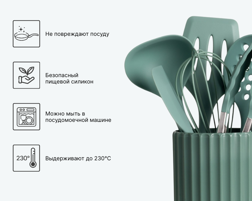 - — Все предметы подходят для работы с антипригарной посудой и могут использоваться при температуре до 230 °C.