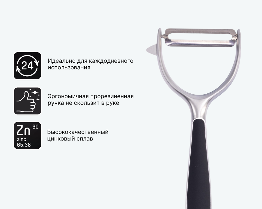Горизонтальный нож BOSQUE подходит для очистки картофеля, моркови, яблок и других продуктов. Лезвие удобно скользит по поверхности, повторяя форму плодов. Корпус из прочного цинкового сплава выдерживает ежедневную нагрузку, а прорезиненная ручка обеспечивает комфортный и надёжный захват. Инструмент удобно использовать как правой, так и левой рукой.