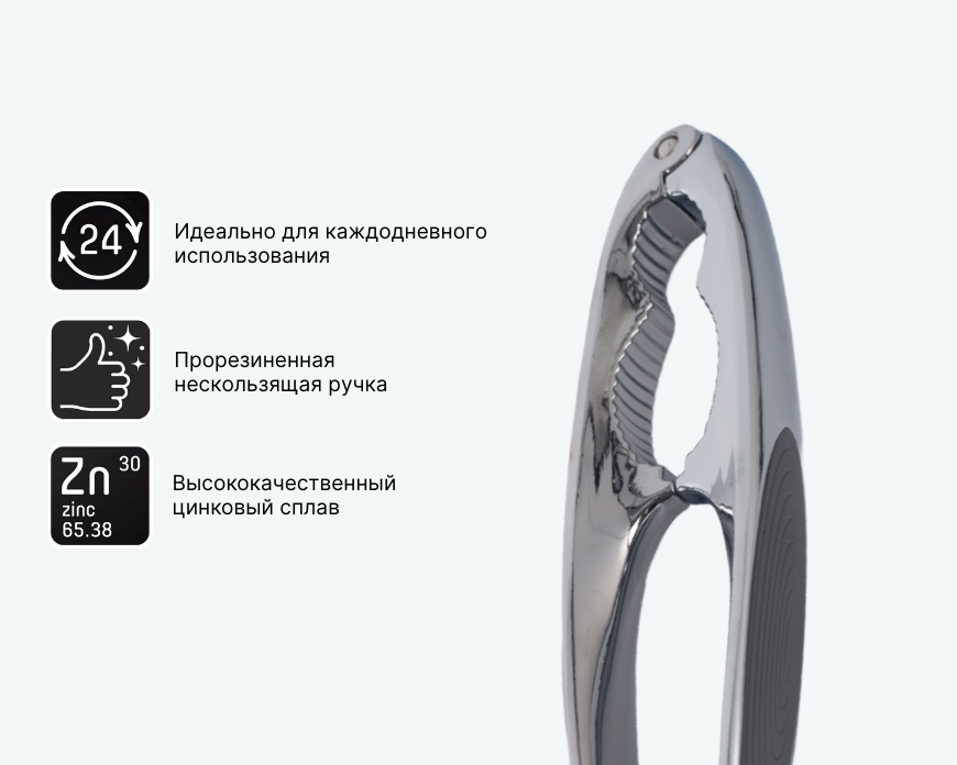Орехоколка QUANTUM — это идеальный инструмент для тех, кто любит орехи. Она изготовлена из высококачественного цинкового сплава, что обеспечивает долгий срок службы. Прорезиненные нескользящие ручки позволяют удобно держать орехоколку во время работы, облегчая процесс раскалывания различных видов орехов.