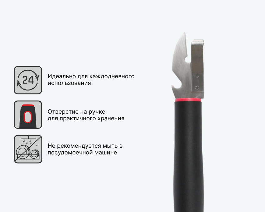 Открывалка ESTILO является надежным инструментом для открытия консервных банок и бутылок. Рабочая часть из высококачественной нержавеющей стали обеспечивает прочность и долговечность. Удобное отверстие на ручке позволяет компактно хранить открывалку на кухне. Она не проскальзывает во время работы, что повышает безопасность. Для продления срока службы рекомендуется ручная мойка.