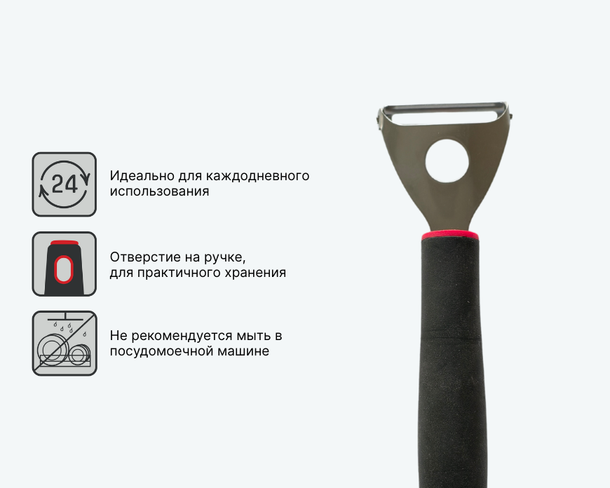 - — Перед первым использованием вымойте овощечистку в горячей воде с мягким моющим средством и вытрите насухо.