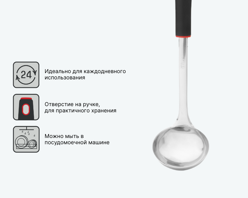 - — Перед первым использованием вымойте половник в горячей воде с мягким моющим средством и вытрите насухо.