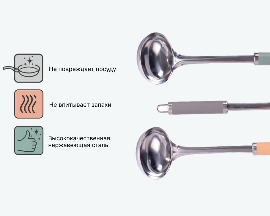 - — Перед первым использованием вымойте половник в горячей воде с мягким моющим средством и вытрите насухо.