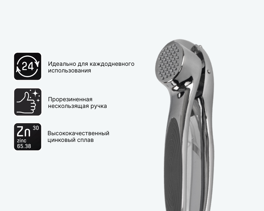 Пресс для чеснока QUANTUM обеспечивает легкое и быстрое измельчение чеснока, делая процесс приготовления более удобным. Изготовленный из высококачественного цинкового сплава, он отличается прочностью и долговечностью. Прорезиненные нескользящие ручки обеспечивают надежный захват, что позволяет с легкостью использовать пресс в повседневной кулинарии.