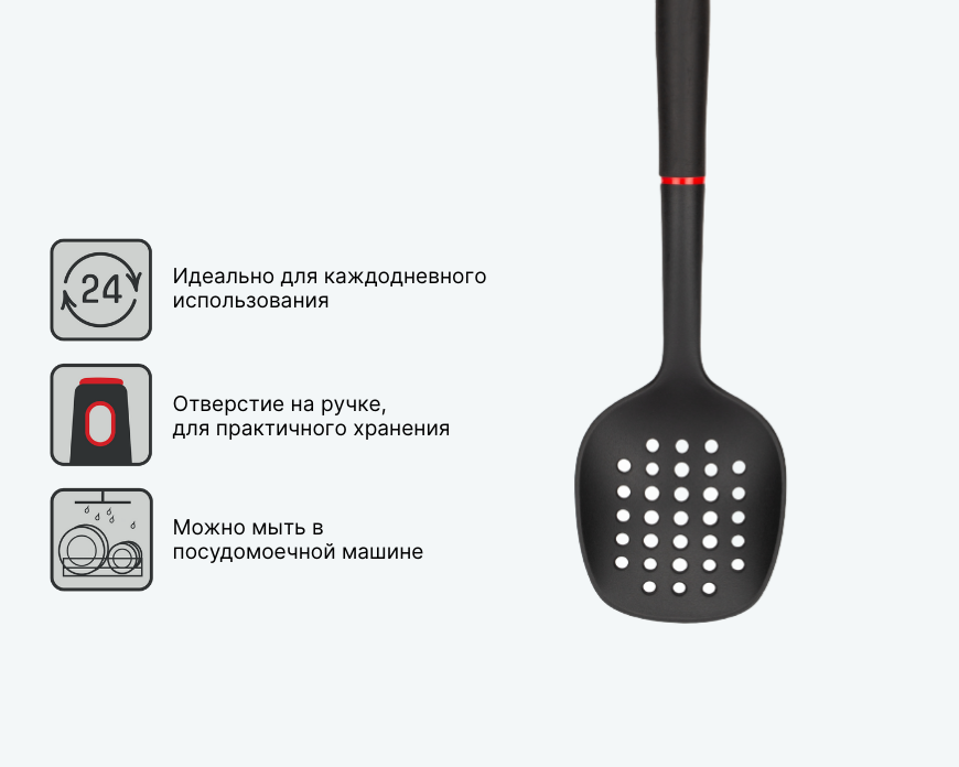 Шумовка ESTILO станет полезным аксессуаром на вашей кухне. Разработанная для ежедневного использования, она сочетает в себе удобство и функциональность. Рабочая поверхность изготовлена из пищевого нейлона, что делает её безопасной для здоровья и позволяет не повреждать посуду с антипригарным покрытием. Чтобы сохранить порядок на кухне, предусмотрено отверстие на ручке для хранения. Шумовка не впитывает запахи, а также подходит для мытья в посудомоечной машине, что упрощает процесс уборки.