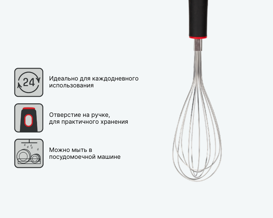 - — Перед первым использованием вымойте венчик в горячей воде с мягким моющим средством и вытрите насухо.