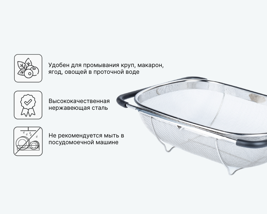 - — Используйте для промывания и слива воды с фруктов, овощей, макарон и других продуктов.