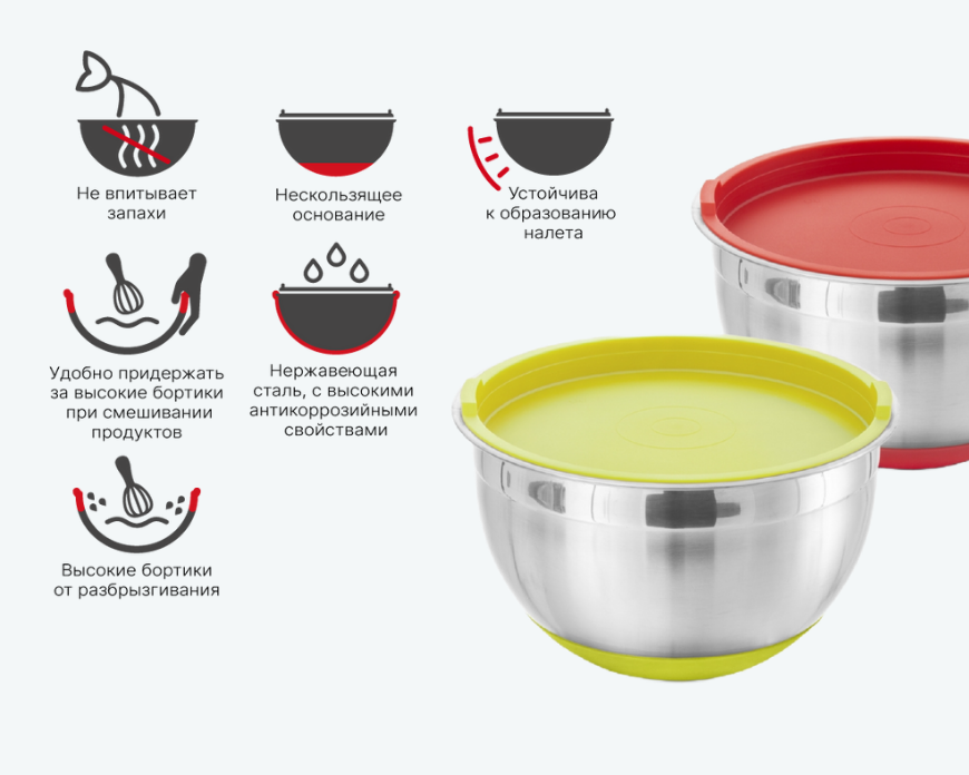 - — Используйте отдельные миски для разных типов продуктов (например, для сырого мяса и овощей), чтобы избежать перекрестного загрязнения.