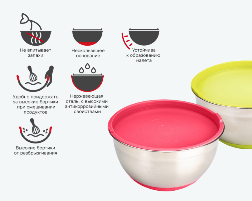 - — Используйте отдельные миски для разных типов продуктов (например, для сырого мяса и овощей), чтобы избежать перекрестного загрязнения.