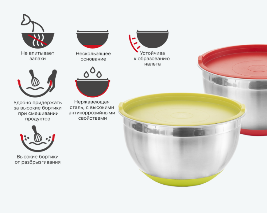 - — Используйте отдельные миски для разных типов продуктов (например, для сырого мяса и овощей), чтобы избежать перекрестного загрязнения.