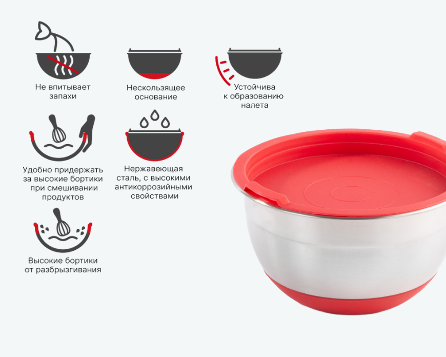 Миска с крышкой MIX красная 1.4 л – это не только красивый, но и функциональный аксессуар на вашей кухне. Изготовленная из высококачественной нержавеющей стали, она устойчива к налету и не впитывает запахи. Нескользящее основание гарантирует безопасность и стабильность, а высокие бортики предотвращают разбрызгивание содержимого, делая ее идеальной для смешивания продуктов