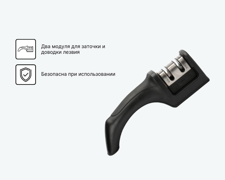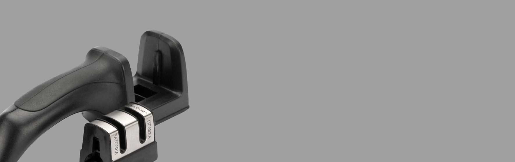 Компактная точилка с двумя рабочими модулями подходит для заточки ножей с гладким лезвием из нержавеющей стали. Стальной шлифовальный модуль обеспечивает быструю правку, а керамический — доводку и полировку режущей кромки. Удобна в использовании и не требует специальных навыков.