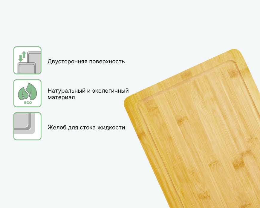 Универсальная доска BAMBOO из натурального бамбука подходит для различных задач. Двусторонняя поверхность и желоб для жидкости делают работу удобной и аккуратной. Материал безопасен для здоровья, не выделяет вредных веществ и подходит для ежедневного использования.