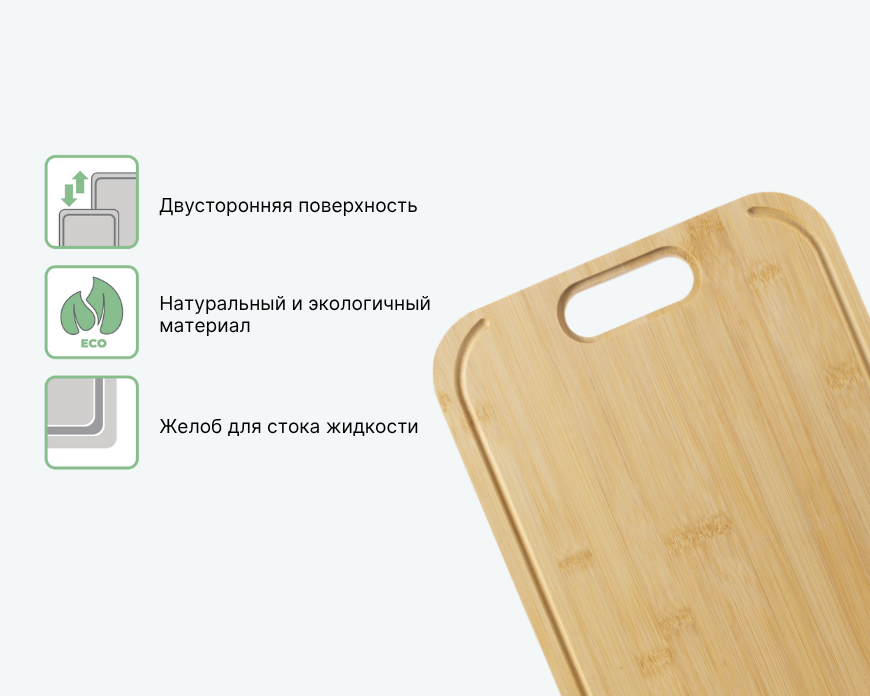 Большая доска BAMBOO TOUCH из бамбука оснащена желобом по периметру, что позволяет удерживать жидкость при нарезке сочных продуктов. Подходит для крупных заготовок. Экологичный материал безопасен для здоровья. Двусторонняя поверхность делает работу более удобной.