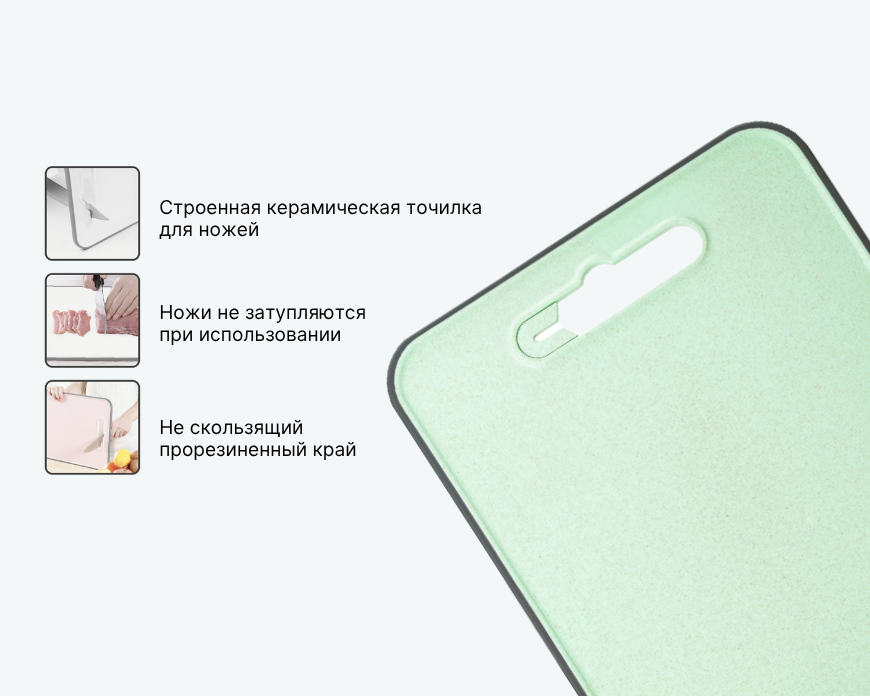 Доска увеличенного размера FIBER снабжена встроенной точилкой для ножей и мини-теркой. Прорезиненные вставки по краям обеспечивают устойчивость. Устойчива к порезам, не тупит ножи и подходит для ежедневного использования. Двусторонняя поверхность упрощает работу с разными продуктами.