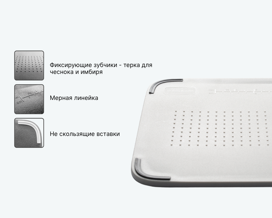 Многофункциональная доска INFINITY оснащена зубчатой вставкой для удержания продуктов во время нарезки, которая также может использоваться как терка для чеснока или имбиря. Прорезиненные края предотвращают скольжение. Встроенная линейка помогает нарезать ингредиенты с нужной точностью.