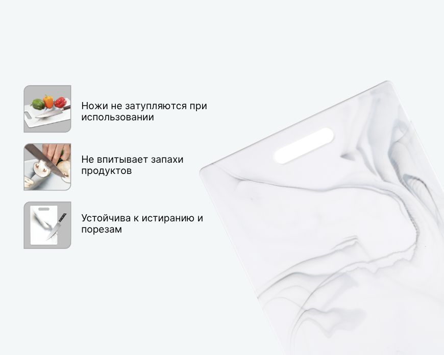 Просторная разделочная доска MARBLE White с удобной ручкой и двухсторонней поверхностью. Не впитывает запахи, не тупит ножи и выдерживает интенсивную эксплуатацию. Увеличенный размер делает её подходящей для обработки крупных продуктов, таких как мясо или капуста.