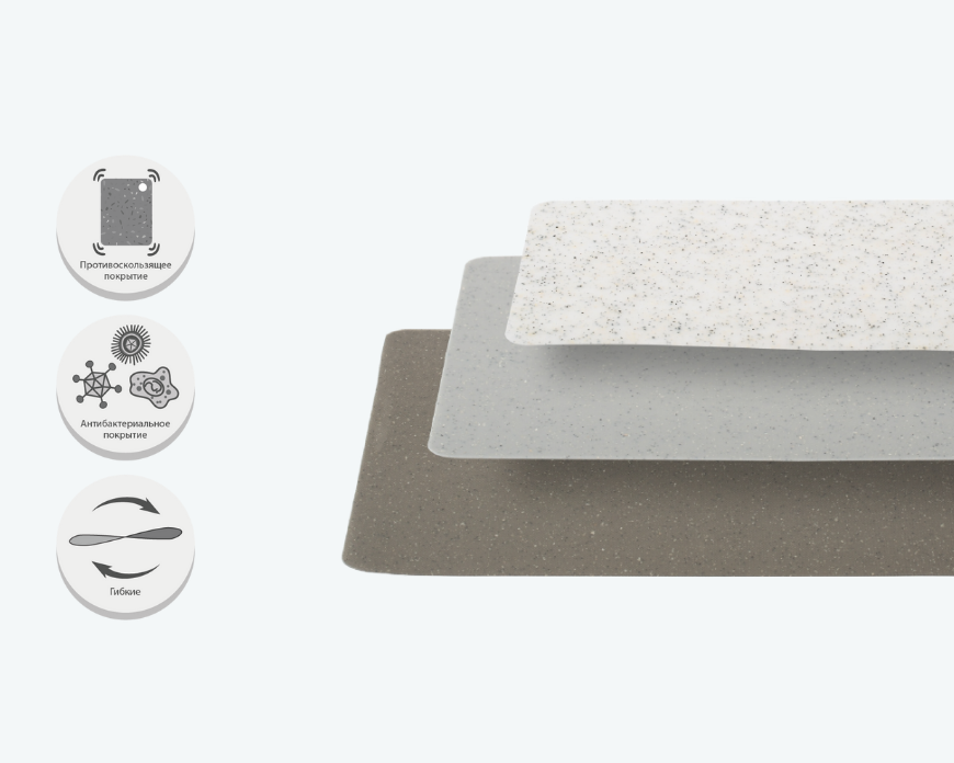 Гибкие доски GRANITE COLLECTION выполнены из прочного и гигиеничного материала с антибактериальной защитой. Подходят для разных типов продуктов, не впитывают запахи и не затупляют ножи. Противоскользящее покрытие и компактные размеры позволяют удобно использовать и хранить. Размеры: 29×19, 33,5×24 и 38×29 см.
