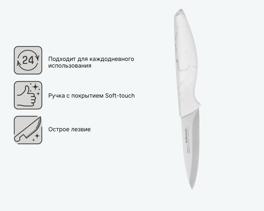 Компактный нож с удобной ручкой с покрытием Soft-touch и острым лезвием из нержавеющей стали. Предназначен для очистки кожуры фруктов и овощей. Лезвие устойчиво к коррозии и сохраняет остроту при длительном использовании.