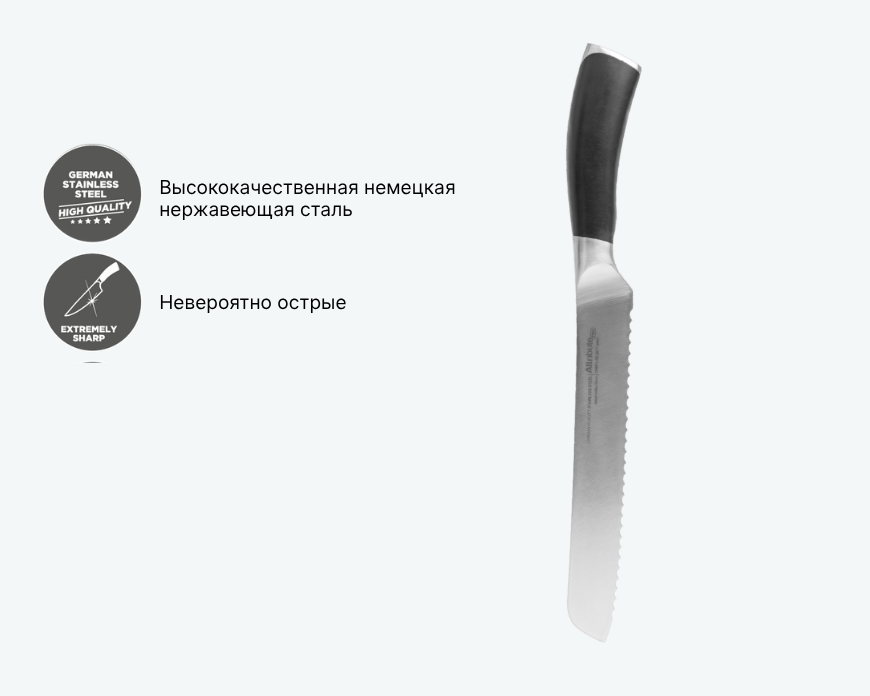 Серрейторное лезвие из стали DIN 1.4116 (55±2 HRC) аккуратно режет хрустящую корочку, не сминая мякиш. Ручная заточка зубцов под углом 9–13° и эргономичная ручка делают работу с ножом комфортной.