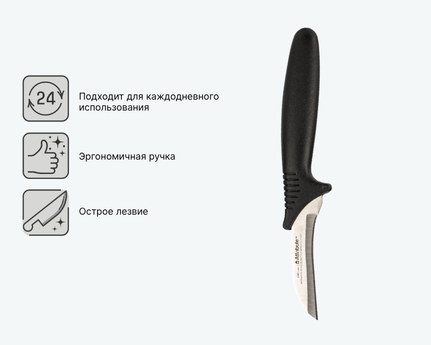 Небольшой нож с заточенным лезвием, идеально подходящий для очистки кожуры и тонкой нарезки овощей и фруктов. Лезвие из нержавеющей стойкой к коррозии стали сохраняет остроту. Удобная пластиковая ручка обеспечивает комфорт при работе. Подходит для создания декоративных элементов.