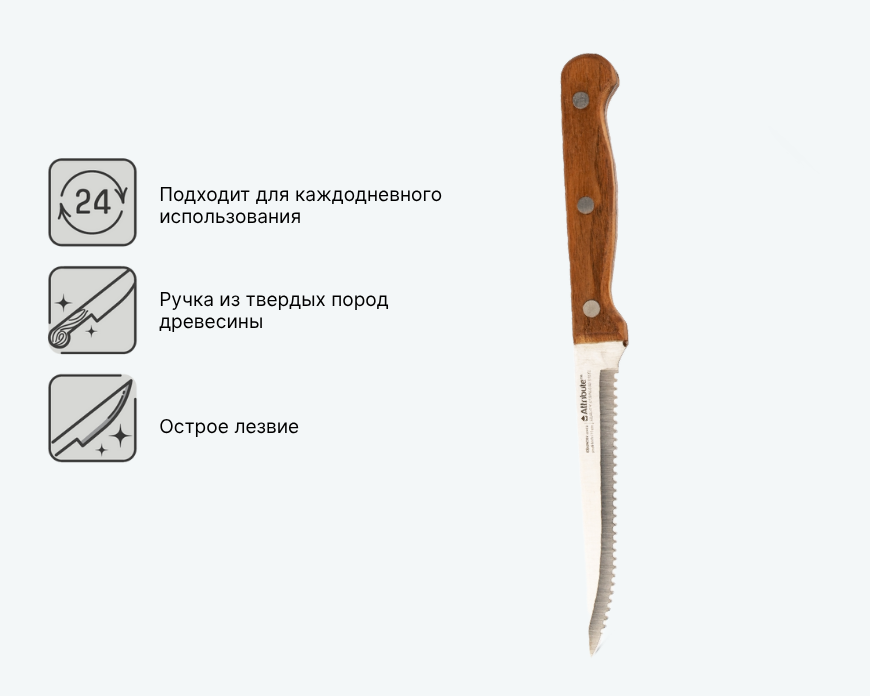 Специальный нож с серрейторным лезвием и деревянной ручкой. Разработан для аккуратной нарезки приготовленного мяса, особенно стейков с волокнистой структурой. Зубчатая кромка не требует частой заточки. Лезвие из нержавеющей стали устойчиво к износу, а натуральная древесина рукоятки придает ножу особую эстетику.