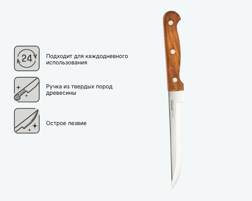 Узкий нож с гибким лезвием и деревянной рукояткой, созданный для разделки рыбы и мяса. Специальная форма клинка позволяет легко отделять филе от костей и жил. Лезвие из качественной нержавеющей стали устойчиво к коррозии. Натуральная древесина ручки обеспечивает удобный хват во время работы.