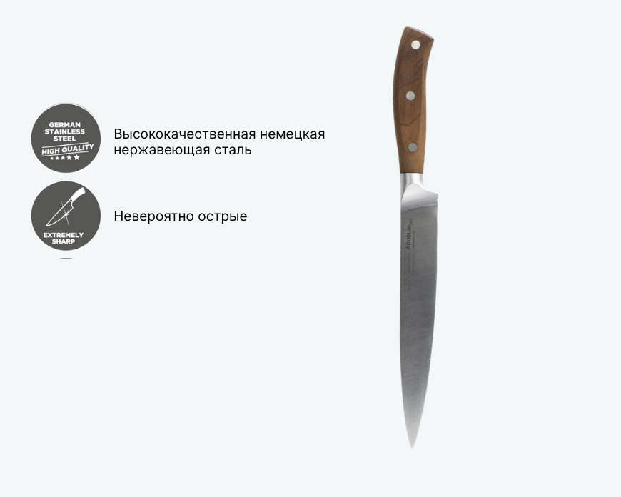 Нож для тонкой разделки мяса и рыбы. Лезвие из высококачественной немецкой стали обеспечивает исключительную остроту и точность реза. Удобная эргономичная ручка снижает усталость при работе.
