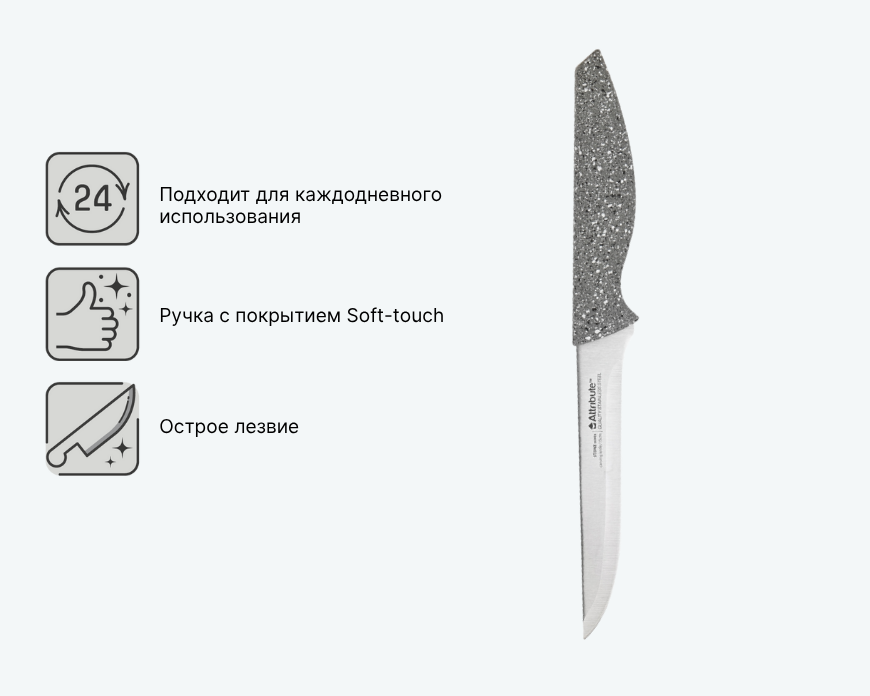 Нож с гибким лезвием для разделки мяса и рыбы. Благодаря особой форме клинка легко отделяет филе от костей. Ручка с покрытием Soft-touch обеспечивает комфортный хват. Лезвие из нержавеющей стали устойчиво к коррозии.