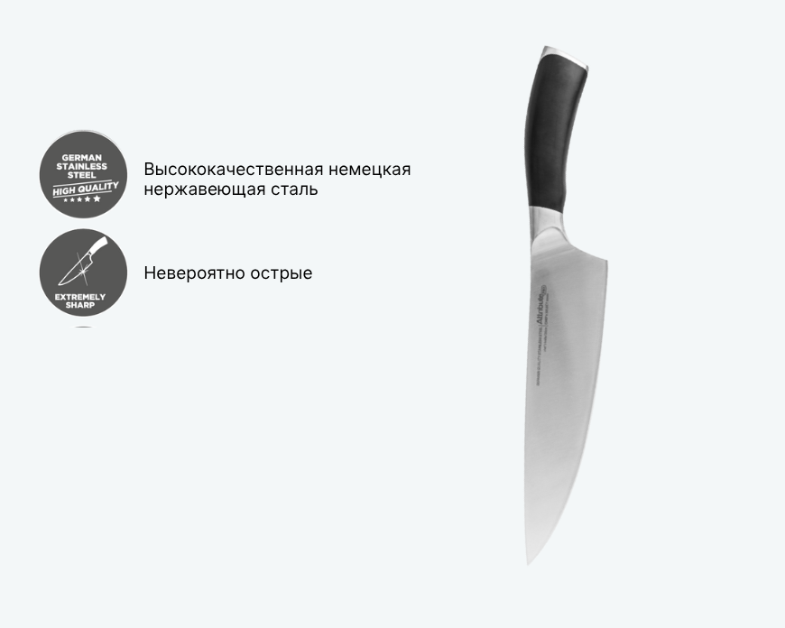 Профессиональный нож с лезвием из немецкой стали (марка DIN 1.4116) повышенной твердости (55±2 HRC). Такая сталь устойчива к коррозии и долго сохраняет остроту. Угол заточки 9–13° обеспечивает точный рез мяса, овощей и других продуктов. Ручная обработка лезвия и эргономичная ручка с продуманным балансом делают нож удобным для длительной работы.