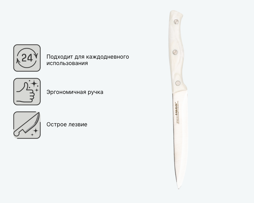 Удобный нож с эргономичной ручкой и заточенным лезвием из нержавеющей стали. Подходит для нарезки овощей, фруктов, мяса, колбасы и сыра. Твердая сталь с антикоррозионными свойствами сохраняет остроту и износостойкость. Компактный размер позволяет использовать его для различных задач на кухне.