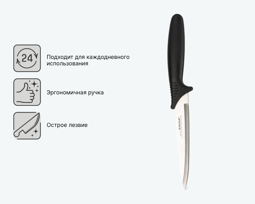 Многофункциональный нож с лезвием средней длины, подходящий для нарезки овощей, фруктов, мяса, сыра и колбасных изделий. Лезвие из твердой нержавеющей стали устойчиво к износу. Эргономичная пластиковая ручка обеспечивает надежный хват. Универсальный вариант для ежедневного использования.