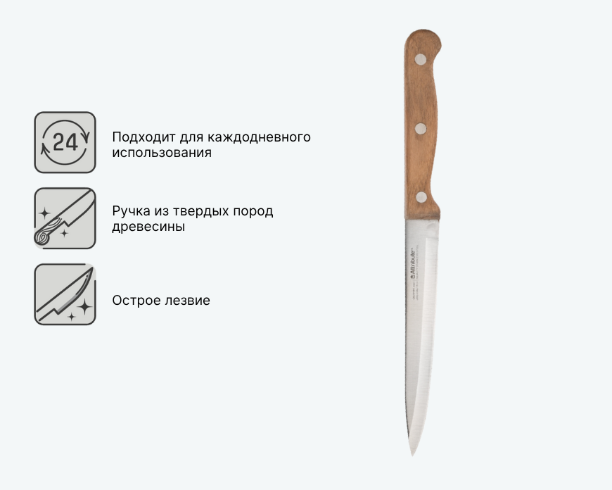 Многофункциональный нож с ручкой из дерева и клинком из нержавеющей стали. Подходит для нарезки овощей, фруктов, мяса, сыров и колбасных изделий. Деревянная рукоятка обеспечивает надежный хват, а качественная сталь лезвия гарантирует долговечность и простоту в уходе. Практичное решение для повседневных кухонных задач.