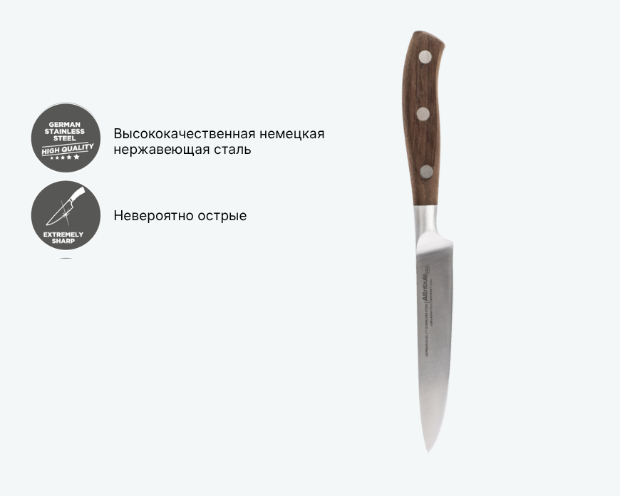 Компактный нож с лезвием из немецкой стали, заточенным вручную. Подходит для нарезки овощей, фруктов, сыра и колбасы. Идеальный баланс и удобная ручка делают его отличным выбором для кухни.