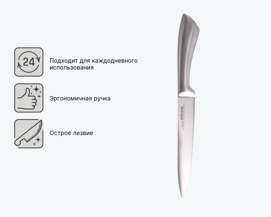 Многофункциональный нож с удобной эргономичной ручкой и острым лезвием. Подходит для нарезки овощей, фруктов, мяса, колбасы и сыра. Изготовлен из прочной нержавеющей стали, устойчивой к коррозии и сохраняющей остроту.