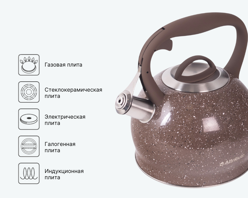 Чайник GRANITE chocolate объёмом 3 л сочетает функциональность и современный дизайн. Лёгкий корпус и ненагревающиеся элементы обеспечивают комфортное и безопасное использование без прихваток. Чайник подходит для всех типов плит, включая индукционные, обеспечивая равномерный нагрев. Свисток можно зафиксировать в поднятом положении при необходимости. Исполнение в шоколадном оттенке станет стильным акцентом на кухне.