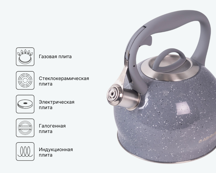 Чайник GRANITE stone объёмом 3 л сочетает практичность и современный дизайн. Лёгкий корпус и ненагревающиеся элементы обеспечивают удобство и безопасность при использовании без прихваток. Чайник подходит для всех видов плит, включая индукционные, и равномерно распределяет тепло. Свисток можно зафиксировать в поднятом положении при необходимости. Стильный серый оттенок придаст кухне изысканный акцент.